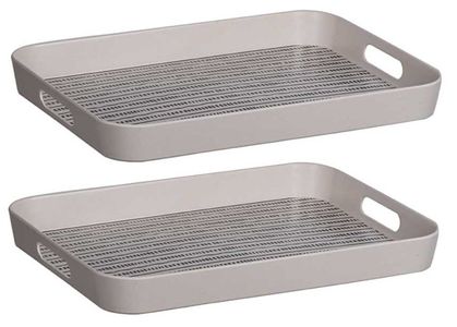 These bamboo and melamine trays make a bright impression with their artistic black-and-white patterns. Each set includes two matching trays, both with smooth curved edges and convenient handles. Use for serving snacks at your next dinner party or integrate it into your home decor as a useful multiple-purpose storage solution.Read More