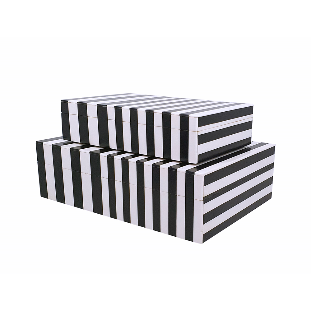 Add eye catching lines with this set of 2 Jacey Lidded Boxes. The set features a larger and small box with a bold black and white stripe. Accented on a coffee table shelf in an art decor inspired design, the Jacey Lidded Boxes will be the star of the show.Read More