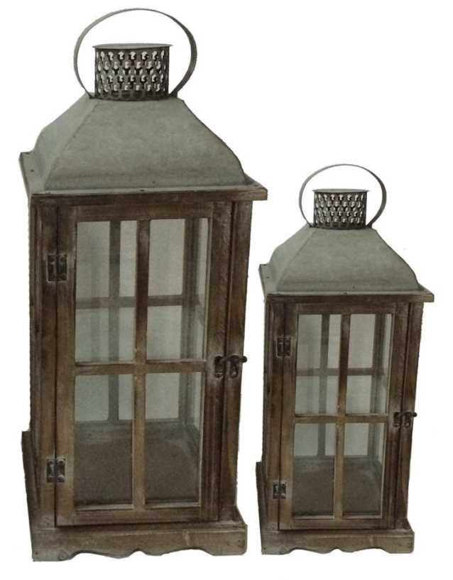 Incorporate function and fashion into your outdoor decor with this set of two wood lanterns. Each lantern is complete with an antique gray iron roof. The set includes one small lantern and one large lantern.Read More