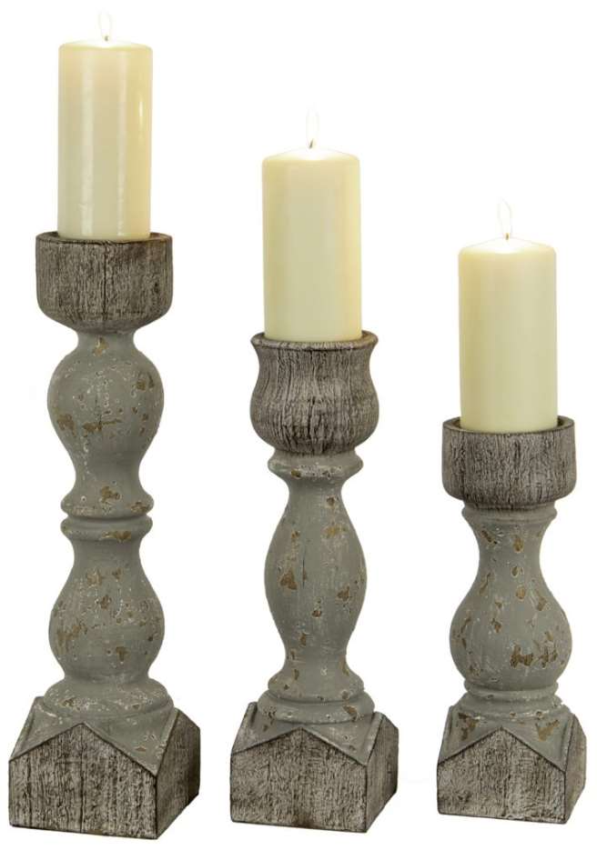 With a traditional column shape, gentle curves, and an antique grey finish, each candle holder in this set of three adds rustic flair to seasonal decor. These polyresin pillar candle holders are perfect accents for farmhouse-inspired decorations in a living room.Read More