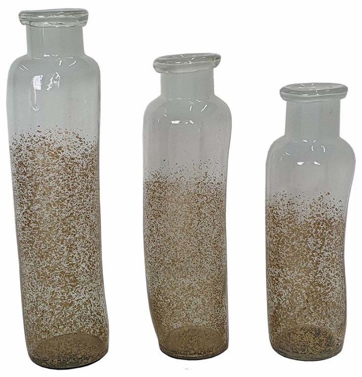 Swirls of honey? No just the set of three mitchell glass vases. The glass bottles display a marble swirl of gold and cream over the clear glass. The set consist three different sized vases, each vase is tall and has a wide opening perfect for adding florals. Featuring a slight shimmer.Read More