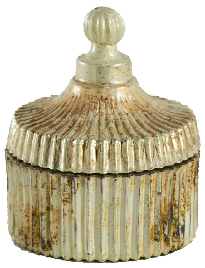 With its shimmering enameled antique mercury finish, this round fluted soy wax candle with lid is a lovely accent for any bedroom or living room. The fluted texture around the exterior makes the mercury finish even more eye-catching. And the pointed lid provides a finished look while keeping the wax inside dust-free.Read More