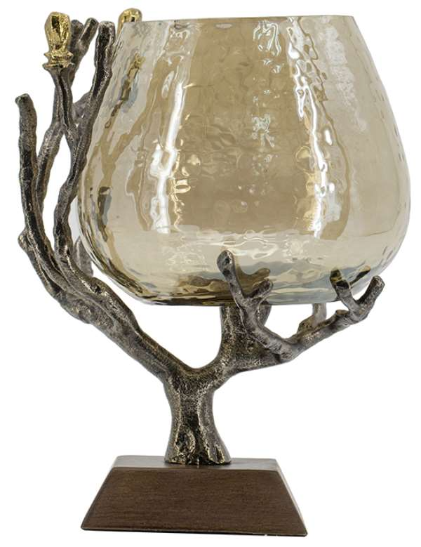 This antique nickel-finished aluminum twig votive holder features subtle gold accenting to complement its textured smoke luster glass shade and walnut-finished wood base. With its natural appeal, this candle holder lends a uniqueness to any tabletop. It’s especially well suited for mantelpieces, dining tables, and living room showcase surfaces.Read More
