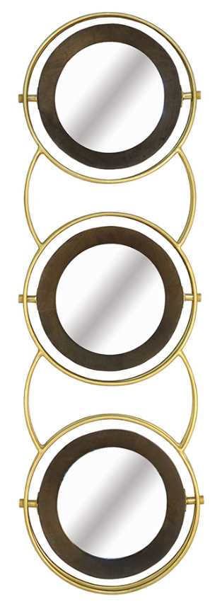 Create visual interest and clean, modern style with the Fallen three-ring accent mirror. Crafted of solid wood and metal, this mirror features three circular mirrors with mango wood frames and concentric metal outer rings. Rounding out the design, two additional gleaming gold overlapping circles bring these mirrors together in a brilliant reflection of great design.Read More