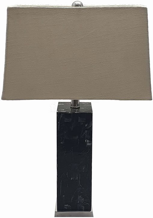 Square black pillar table lamp is made from inlaid resin with a clean metal