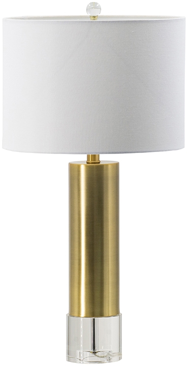 Brass finish metal and clear acrylic combine with a white drum shade to make a contemporary cylinder table lamp that can’t be matched. Created from simple elements and quality materials, this fixture uses a tall and lean profile to complement minimalist tabletops and furniture. It’s the perfect addition to smaller tabletops at sofa sides, alongside dining room tables, in hallways, and beyond.