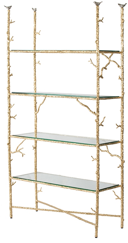 This glass shelf etagere uses its tall frame to present a beautiful motif inspired by nature. The four glass shelves provide sleek and useful storage space. On either side, tall golden bars depict branches adorned with charming birds. The sizable frame is sturdy and functional while maintaining the beautiful design that makes this shelf an artsy addition to a living or dining room.Read More
