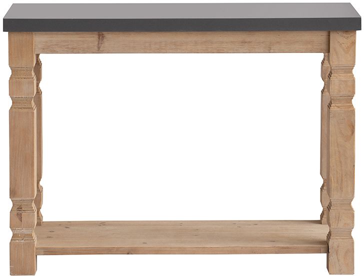 This dynamic console table has a powerful presence, with its concrete surface and superbly detailed wooden frame delivering style and substance. The gray concrete tabletop and wooden body complement each other beautifully, while the turned wooden legs give the piece an impressive decorative quality. Rustic and modern, this table is a striking piece for your living room.