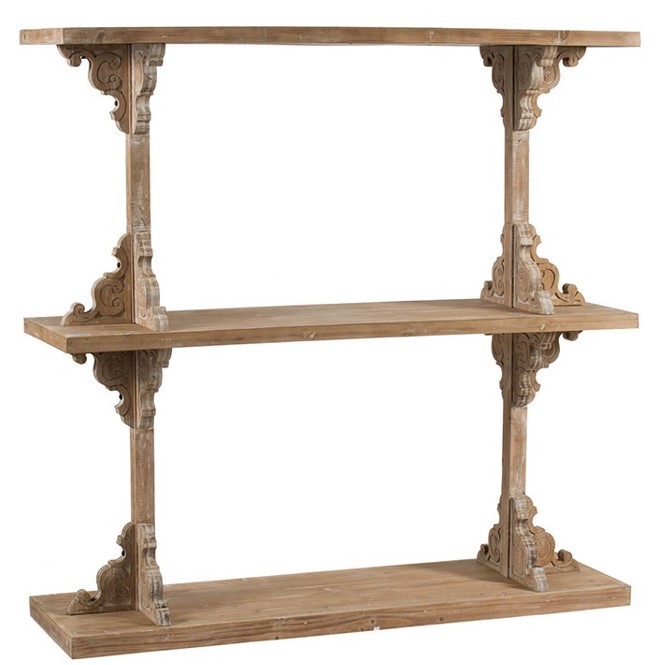 Scrollwork accents each post in this 3 tiered shelf, which is made of wood with a whitewash natural finish. The open shelves of this piece serve as an elegant backdrop to the decor and mementos that can be displayed on each tier.Read More