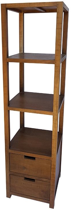 Open shelving and matching drawers make this natural wooden bookshelf easy on the eyes and exceptionally useful. Twin drawers at the base use ring pulls to open and store items you want kept out of sight. The open design of the top makes this an ideal shelving unit for display pieces as well as books and whatever other knickknacks need a home.