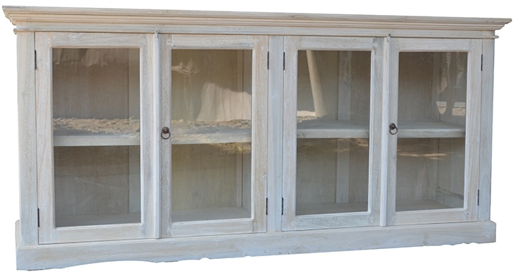 Four doors and a long body create substantial enclosed storage and plenty of stylish charm in this elegant wooden cabinet. Two sections use loop pulls to open, providing easy access to whatever sits behind the decorative glass. A washed white finish highlights the cabinets vintage appeal, while the size and shape make it an excellent addition to any modern home.