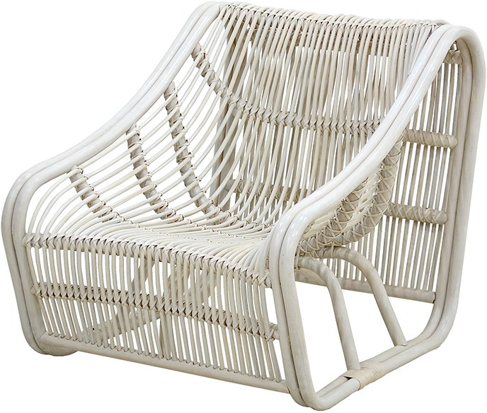This low curved wicker chair brings a combination of vintage craftsmanship and modern design to living rooms. The white frame has a cohesive outline, with the armrests curving over the back of the chair and running down to become the sleigh base. The tight weaving of the wicker through the seat and backrest creates comfortable support while also delivering an intriguing visual.