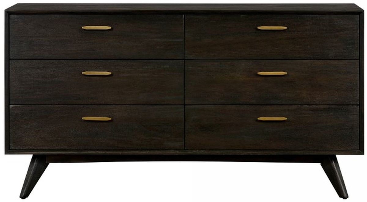 The Armen Living Baly Acacia Mid-Century 6 Drawer dresser sits atop beautiful tapered legs and features a beautiful brown and gray brushed finish. The top drawers are lined in velvet and provide ideal storage for your jewelry or watches. The antique brass handles compliment the brown and grey brushed finish. The Baly bedroom collection features a 2-drawer nightstand and platform bed in your choice of king or queen size. All available in the brushed brown and gray finish with antique brass accents.