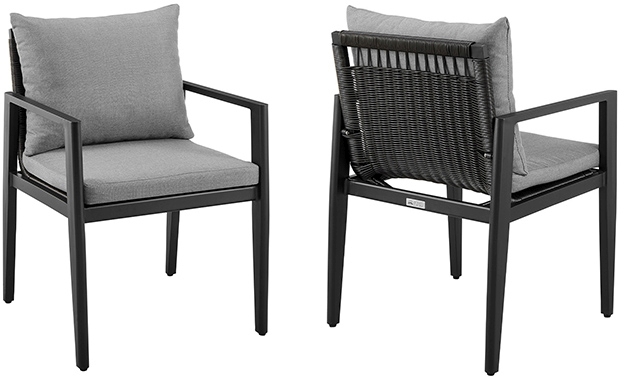 These beautiful metal and wicker patio furniture pieces include plush dark grey high-density foam cushions to offer a cozy sitting experience and strong aluminum arms for added comfort. The cushions also feature a zipper closure that allows for easy removal and cleaning! Featuring an inviting and versatile design, these dining chairs sit easily in any backyard, patio, pool area, garden, or screened-in porch. Made up of lightweight and durable aluminum framework, the Cayman outdoor chairs with cushions are easily portable and feature a multi-layer powder coating for further effective protection from the elements and everyday wear and tear. Without having to worry about UV, rust, or weather damage, the Cayman chairs are the ideal choice of outdoor patio furniture for your home, regardless of your location. Constructed from durable materials, the Cayman patio dining chairs allow for an easy and hassle-free setup all year-round and will quickly become your favorite piece of outdoor furniture. The Cayman dining chairs have a seat height of 19 inches, are sold as a set of 2, and feature a beautiful black powder coated finish, dark grey cushions and support up to 308lbs per seat.