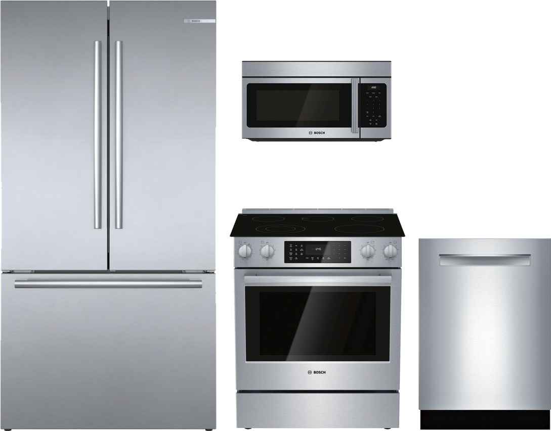 Bosch 4 Piece Kitchen Package-Stainless Steel with a French door bottom freezer refrigerator, slide-in electric range, built in dishwasher and over the range microwaveRead More