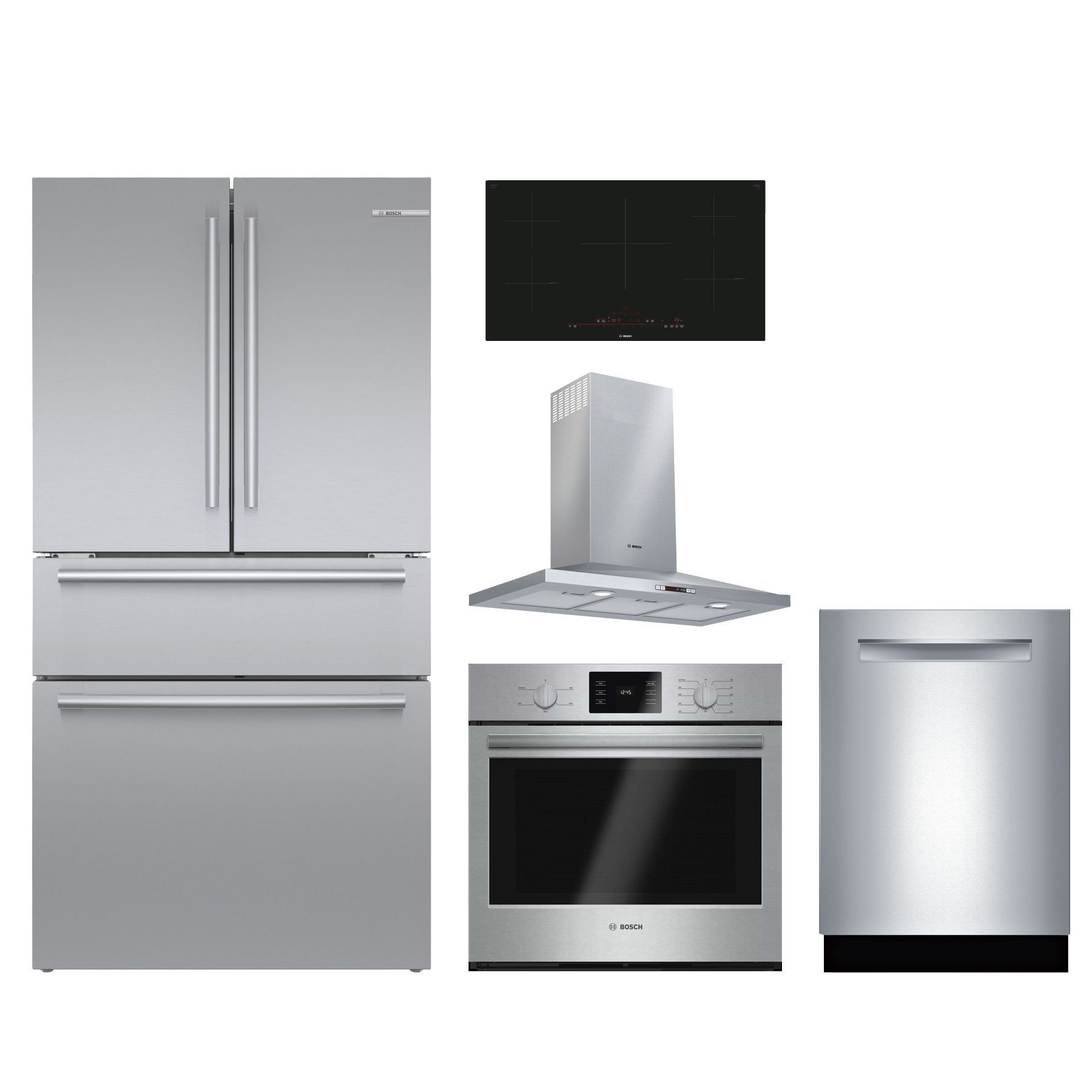 Bosch 5 Piece Kitchen Package with a french door refrigerator, range hood, built in dishwasher, induction cooktop, and single wall ovenRead More