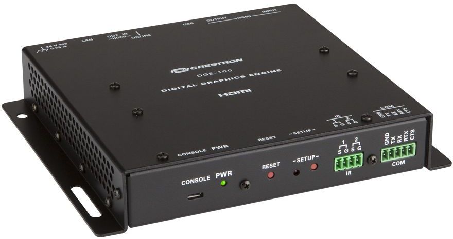 The DGE-100 Digital Graphics Engine transforms an HD touch screen display into an advanced Crestron® controller. Featuring Crestron Smart Graphics™ technology, the DGE-100 provides for the creation of a completely custom graphical environment combining advanced controls for audio & video, lighting, shades, HVAC, security, and other functions with dual-window video display, annotation, audio feedback, and web browsing. Its low-profile, surface-mountable design allows for a discreet installation behind a flat-panel display, under a table, or inside a lectern or equipment rack.The DGE-100 features an HDMI® output for connection to the display device, and includes a USB HID port for touch, mouse, and/or keyboard input. Additional control ports are provided to enable control of the display device and other equipment. A single HDMI input allows an AirMedia® wireless presentation gateway or other high-definition video source to be connected and displayed on screen. Additionally, H.264 streaming video signals can be received over a high-speed Ethernet connection. Ethernet also provides the interface to a Crestron control system.