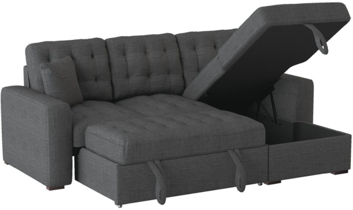 The versatility and functionality of the McCafferty Collection goes beyond that of a traditional sofa. Covered in dark gray fabric, the transitional profile of this seating group is complemented by stitch tufting and track-style arms. Conveniently stored beneath the sofa is a pull-out trundle that rises to create a bed while the top of the attached chaise opens to reveal under-seat storage.