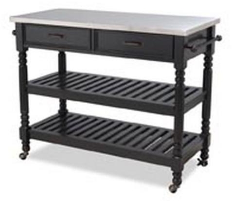 Practical and charming, the General Line Kitchen Cart by homestyles features solid hardwood and engineered wood construction in a black finish with a stainless steel top. Dark antiqued bronze hardware. It features two easy-open storage drawers, two slotted shelves that can be used for general storage or as wine racks. Adjustable center shelf. Heavy-duty, locking rubber casters allow for mobility.