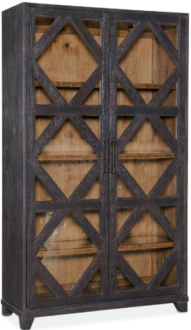 Vintage and rustic, the Big Sky Cabinet has a bold and simple design featuring seeded antique glass doors with a diamond-and-cross-beam pattern decorative overlay. The Charred Timber finish on the exterior contrasts with a Vintage Natural finish on the interior that reveals the authentic knots and wood grain of the Pecky Hickory Veneers.Read More