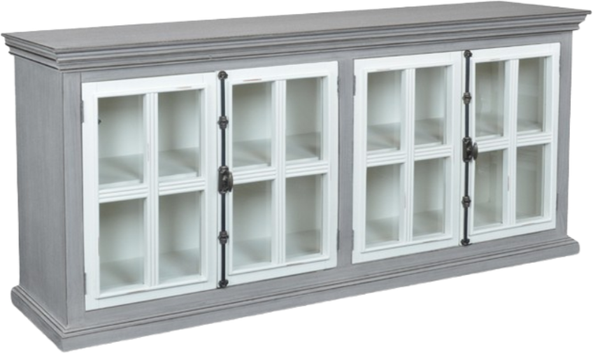 The Florence console features a charming two-tone design crafted from pine solids and veneers with a multi-step lacquer finish and subtle rub-through edges. It offers generous molding trim, glass-front doors with decorative cremone bolt pulls, fixed interior shelves, and arrives fully assembled.Read More