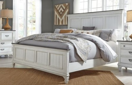 Bed features a bead board panel design, Charcoal-grey cap rail, bolt-on bed rails, and center-supported slat system