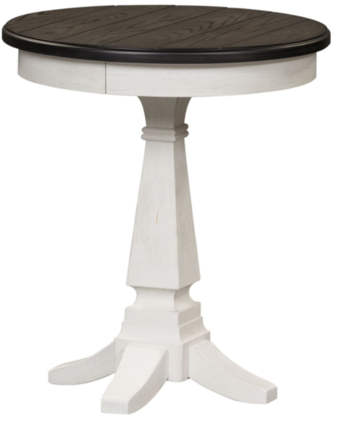 Accent your living space with the Allyson Park chair side table. Crafted of pine and rubberwood solids with cathedral white oak tops, this piece features a wire-brushed white finish with a charcoal top, and planked top, and is anchored by a square-turned pedestal base with flared-out feet.Read More