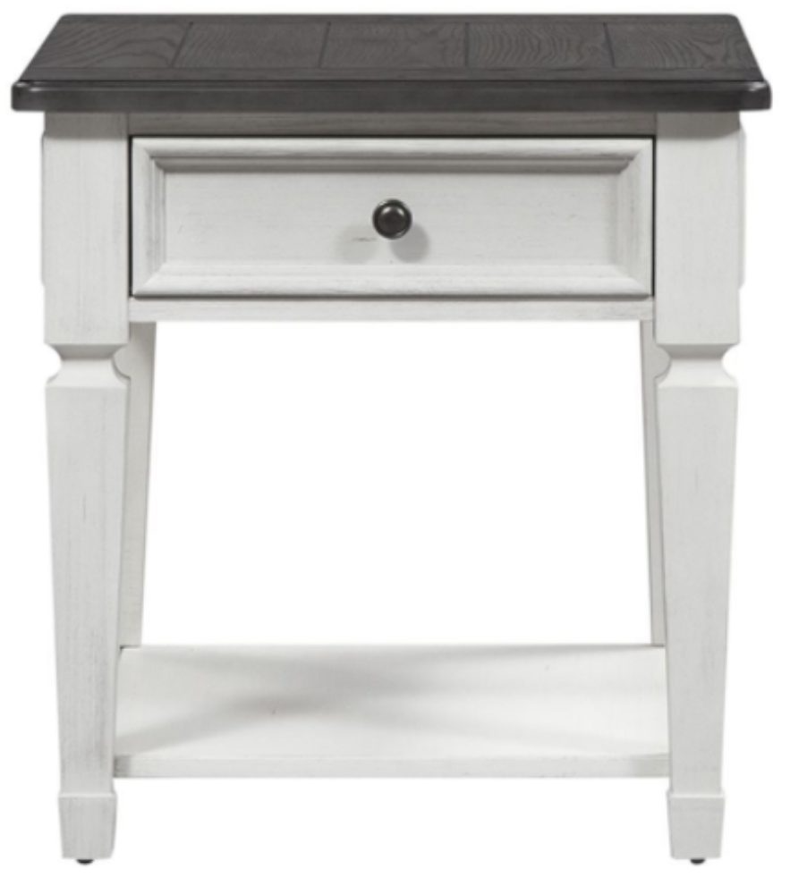 Enhance your space with the Allyson Park drawer end table. Crafted of pine solids and veneers with cathedral white oak tops, this piece features a wire-brushed white finish with a planked charcoal top. This classic end table would make a gorgeous addition to your casual-styled home.Read More