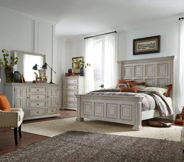 ive life beautifully with the Big Valley king panel bed, dresser, mirror, and chest. Crafted of rubberwood solids with wood products, this kit features a whitestone finish with heavy distressing, wood framed doors and drawers, graduated bead molding creating architectural interest, square pilasters and block feet.Read More