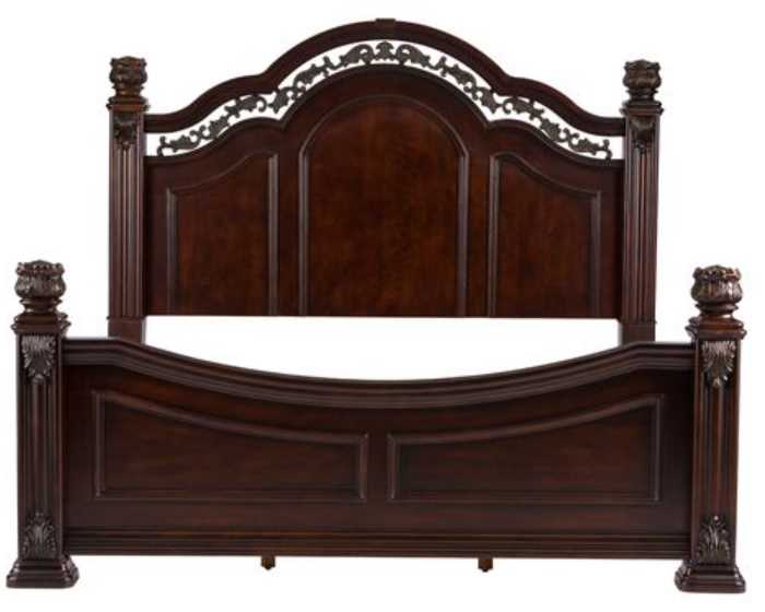 Messina Estates traditional design exudes luxury of European styling. Impressive in scale and rich in details such as scrolled metal accents, antique brass bail hardware, and acanthus leaf carvings. Finished in a rich cognac with gold tipped highlights on carvings.