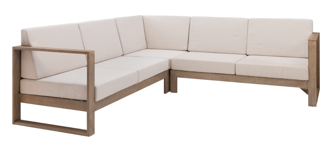 Redefine your outdoor gathering space with this expansive streamline modern sectional. The oversized tonal color scheme is led by beige olefin upholstery over high density cushions for inviting seats resistant to water, uv rays and mildew. Solid eucalyptus wood forms sturdy frames that are also exceptionally weather resistant.Read More
