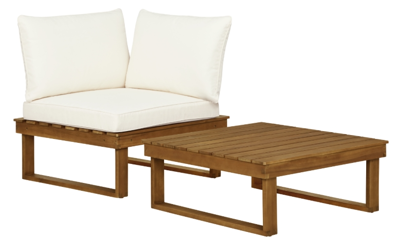 Elevate your outdoor oasis with our outdoor Table and Corner Chair! Crafted with a sturdy wood frame, the warm teak oil stain adds natural charm. Sink into comfort with the beige fabric cushion, creating a cozy corner of relaxation. With a weight capacity of 150lbs, the table is perfect your favorite summer treats.Read More