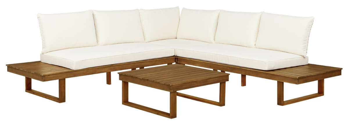 Transform your outdoor haven with our teak infused Conversation Set! Crafted with a teak oilstained wood frame, it radiates charm and durability. Sink into bliss with 100% polyester beige cushions on two loveseats and a corner chair. Each loveseat boasts a robust 400lbs capacity, while the corner chair holds 275lbs.Read More