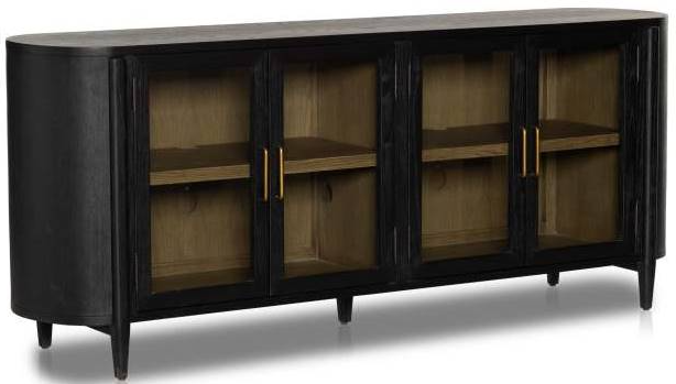 A study in contrast, the Belmont Sideboard is crafted from black-finished oak with glass doors that display lighter interior shelves. An oval silhouette, tapered legs, and brass hardware add to its elegance.Read More