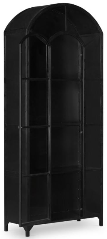 Sleek and spacious, the Brady metal cabinet is ideal for showcasing dishes, books, or other cherished treasures. This arched display cabinet is enclosed with a glass door and features solid iron sheeting finished in a soft, matte black and contrasting brass hardware.Read More