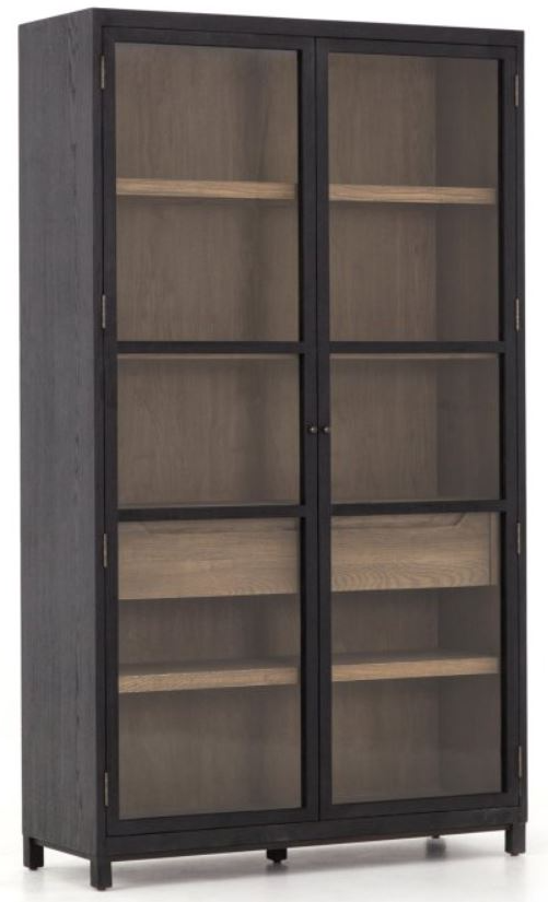 Black drifted oak frames lighter interior shelving for a subtle yet striking contrast in the Britt cabinet. Transparent glass doors protect and display dishware, books, or cherished items, while an interior drawer provides out-of-view storage.Read More