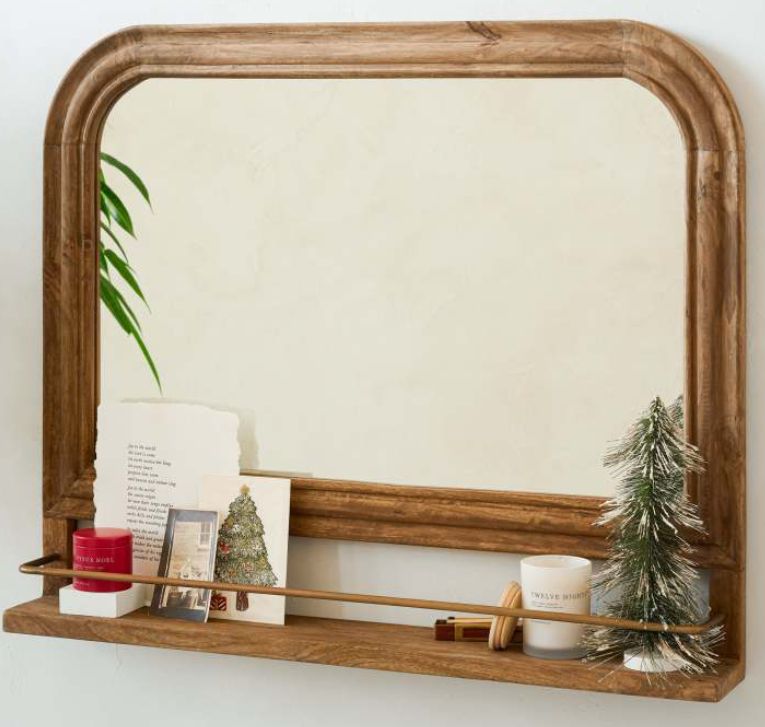 Our take on an antique mirror we found in Round Top, Texas, this wooden mirror is framed with textured wood and layered with functionality. A shelf and brass bar lining the bottom keep favorite finds in place and make it ideal for filling a bathroom or entryway wall.Read More