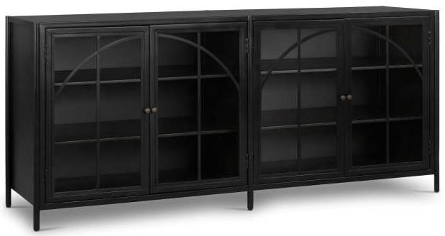 Grand in presence, the Gristmill Sideboard features modern, arched framing forged from iron. Open shelving peers through tempered glass panes, allowing styling opportunities from the inside out. Make a statement by incorporating this sideboard into your home.Read More