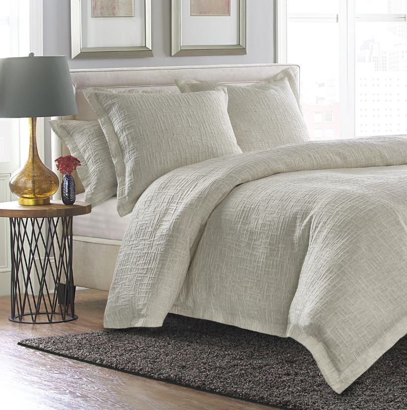Manifest your inner serenity with the Hillton Duvet Set. Designed with a lovely raised linear texture, this bedding look showcases a soft architectural look within a casual style. The duvet has cotton/poly back fabric and button closure to easily secure an insert (not included), and the duvet and shams have 2-inch flanges.Read More