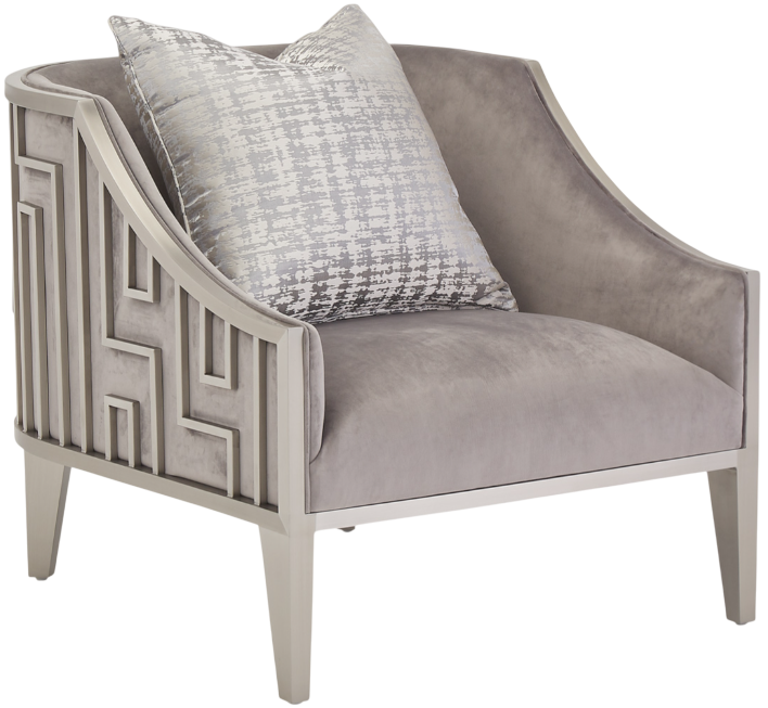 Chair cushions and body are upholstered in steel gray velvet