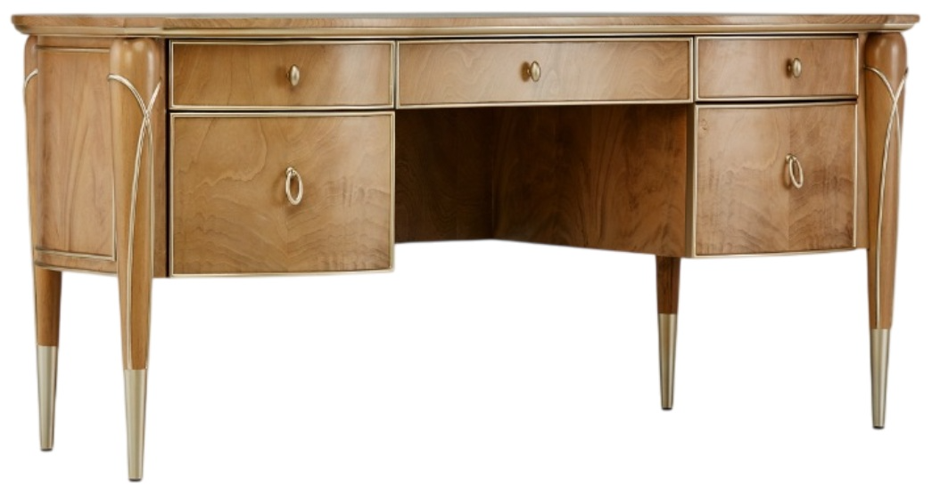 The Villa Cherie desk seamlessly blends function with style. Velvet lined drawers and a wide desktop bring the practicality while chic Chardonnay accents, exquisite hoop pulls, and Swirl Mahogany veneers make this piece stand out in a crowd.Read More