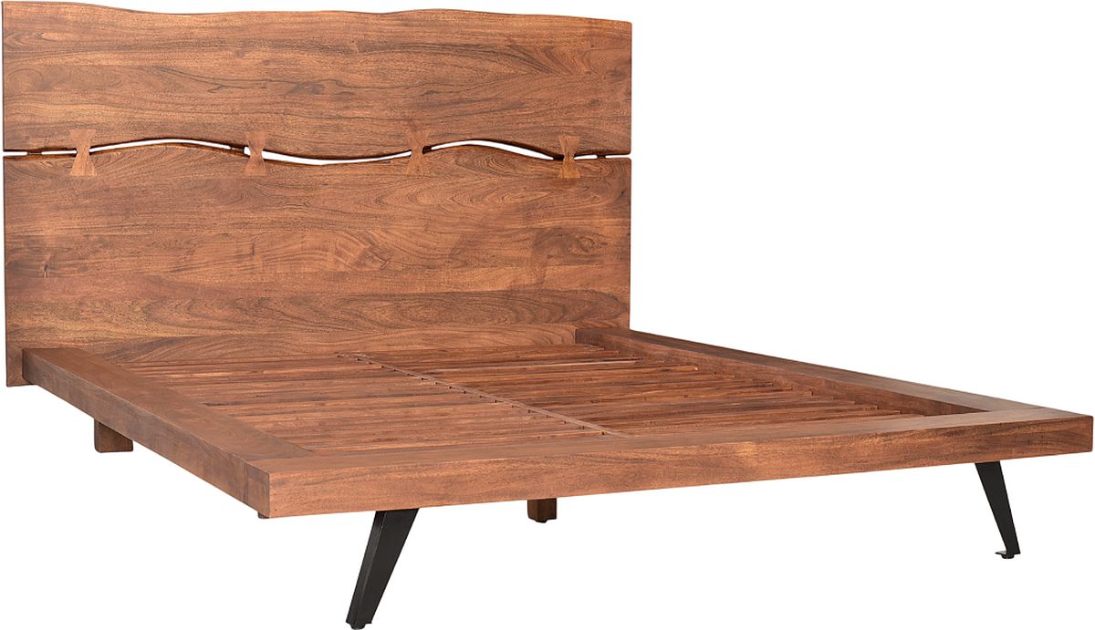 Crafted from solid acacia wood, this bed showcases a low platform design accentuated by an organic edge headboard, masterfully joined using the intricate butterfly woodworking technique with the entire bed supported by solid steel legs in a black powder-coated finish, elevating its rustic-industrial allure.Read More