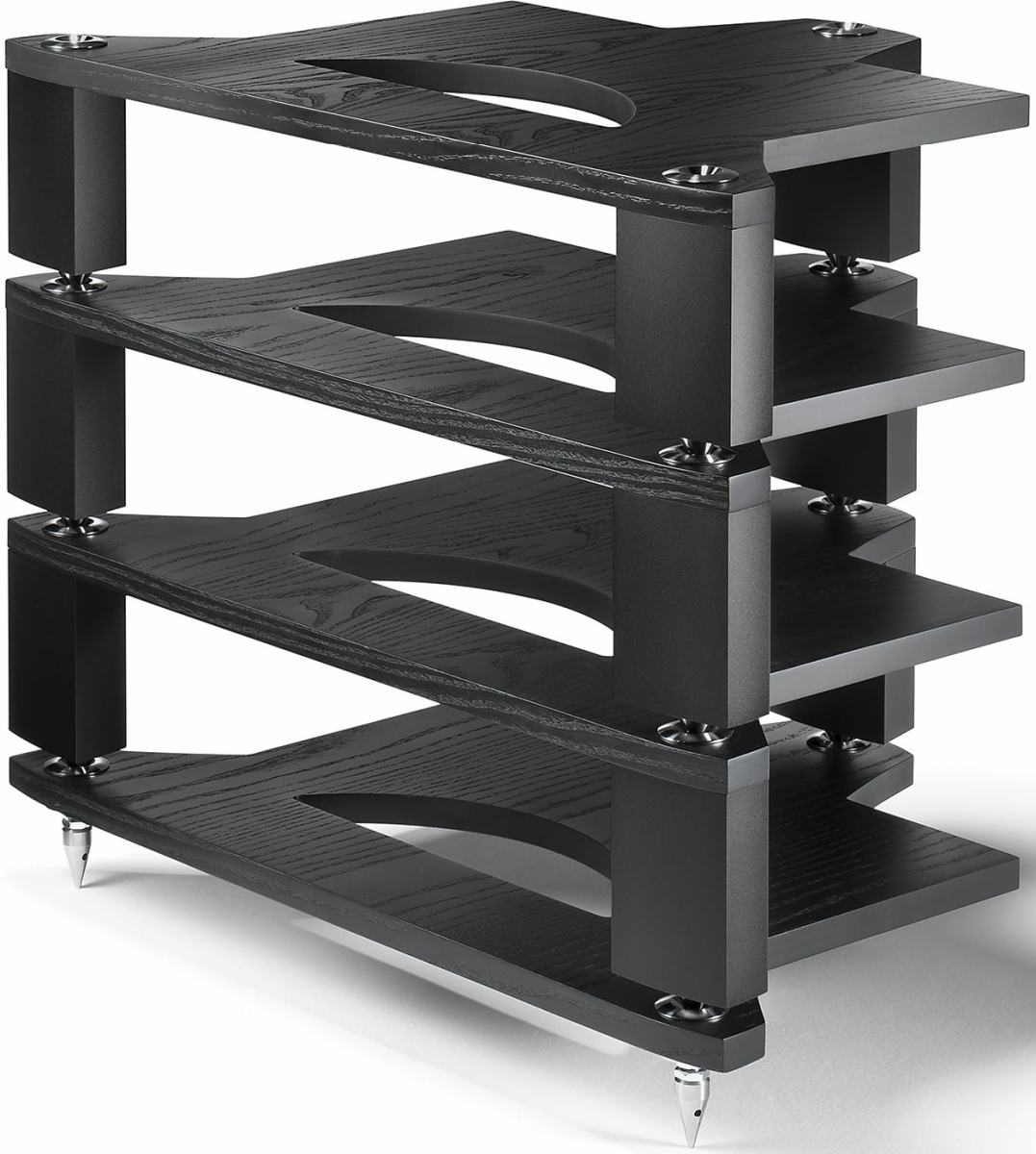 Rather than two-stage base level isolation, FraimLite incorporates just a single set of three cone and cup minimal contact interfaces. Each FraimLite shelving level then forgoes the Fraim’s glass sub-shelf to support equipment directly on veneered composite panels.