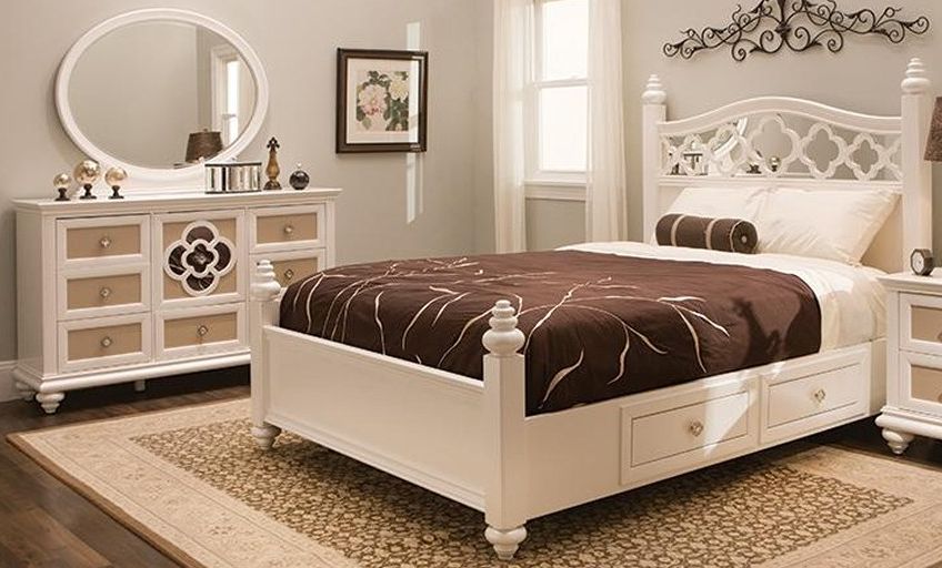 With this charming bedroom set for children and teens, the attraction is all in the details. The whimsically-shaped, hand carved legs, the clever close-up mirror, all with clover shaped accents, including the headboard and drawer pulls, come together to bring a bit of inspired delight. The creamy white finish and neutral brown panel accents make this bedroom set the perfect start to any type of décor. Add versatility by choosing the bed and pieces that best fit your space. Both beautiful and unique, this bed, dresser, nightstand, and mirror is perfect for your child to grow up in.Â