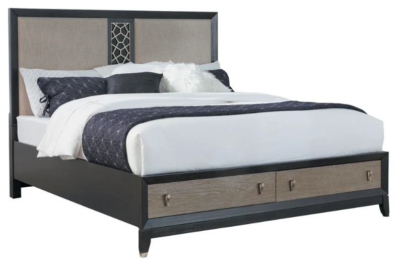 Details, such as the inset metal fretwork over black acrylic surrounded by the fully upholstered headboard panels and the geometric brushed metal pulls on the underbed storage, make this bed one that you will love to relax in.