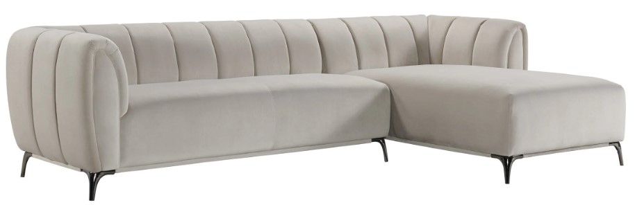 Sensuous velveteen fabric covers an overstuffed sofa and lounge in the Roma Sectional. The creamy taupe-colored fabric gives a tranquil feel to this luxuriant set with a unique channel tufted design and black nickel-finished metal legs. This sectional combines contemporary design with the comfort you expect in your home.Read More