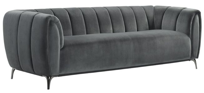 This couch is overstuffed in the best way possible. Luscious velour fabric in a sedate gunmetal color sits on black nickel-finished metal legs. A fun tufted scallop upholstered style makes you want to cuddle up on this sumptuous sofa.Read More