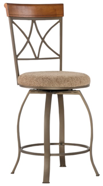Matte pewter and bronze finish metal framing and an open diamond back design crowned with wood add transitional charm to this Swivel Stool. Designed for comfort and style, the Stool is a neutral addition that brings warmth and inviting character to any kitchen or dining area.Read More