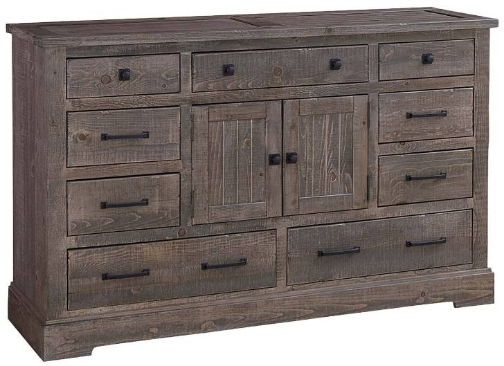 Solid wood salvaged pine construction framed in tongue and groove on case tops. This dresser has solid wood drawer dado construction with metal drawer guides, simple single bracket base, graphite hardware featuring round knob with back plate and simplistic complimenting handle. Also features doors with an adjustable shelf.
