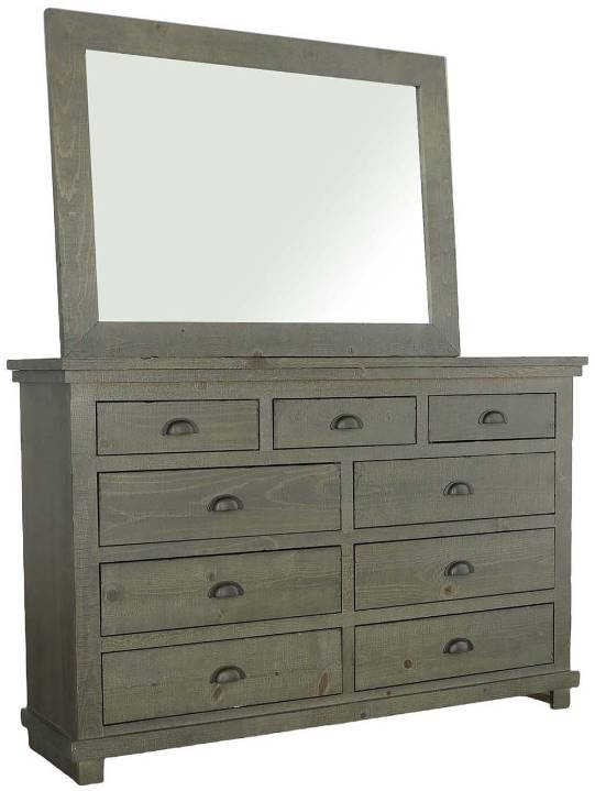 Tongue and groove construction with pine solids produce durable cases, inset drawers constructed of solid pine drawer interiors with metal positive stop guides and gunmetal finish on nostalgic cup pulls. Mirror features an extra wide frame finished in a Distressed Dark Gray.